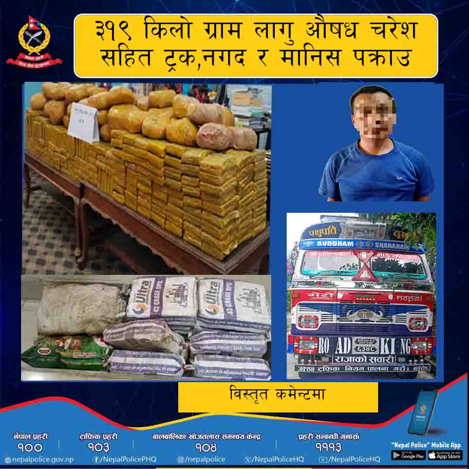 २०८२-०८-२८१. बारा, जितपुर सिमरा उपमहानगरपालिका वडा नं. ०१ पथलैया चेकप्वाईन्ट स्थितबाट बिलबिजक भन्दा फरक भएको खुर्सानी, मोबिल, सर्जिकल, पेन्ट, किट्नासक औषधी, चना, ईलेक्ट्रिकल, जुत्ता, टेपसोल, लिक्युड, मोबिल, मेडिसियन तथा जाली लगायतका) अन्दाजी रु.१,९४,४२,४१४।- (एक करोड चौरानब्बे लाख बयालिस हजार चार सय चौध) बराबरको सामान सहित ना ७ ख ९९९६, ना ७ ख ११७४, ना ६ ख २९१६ र प्रदेश ०२-०३-००१ ख ४४८५ नम्वरको ट्रकहरु शनिबार बिहान प्रहरीले नियन्त्रणमा लिएको छ । प्रहरी चौकी पथलैयाबाट खटिएको प्रहरी चेकिङ्ग टोलिले बिशेष सुचनाको आधारमा वीरगंज बाट पथलैया तर्फ आउदै गरेको ट्रकहरुलाई रोकी चेकजाँच गर्दा उक्त ट्रकमा बोकेको सामानहरु बिलबिजक भन्दा फरक देखिएकोले उक्त सामानहरु सहित ट्रकहरु प्रहरीले नियन्त्रणमा लिएको हो । यस सम्बन्धमा प्रहरीले आवश्यक अनुसन्धान गरिरहेको छ ।