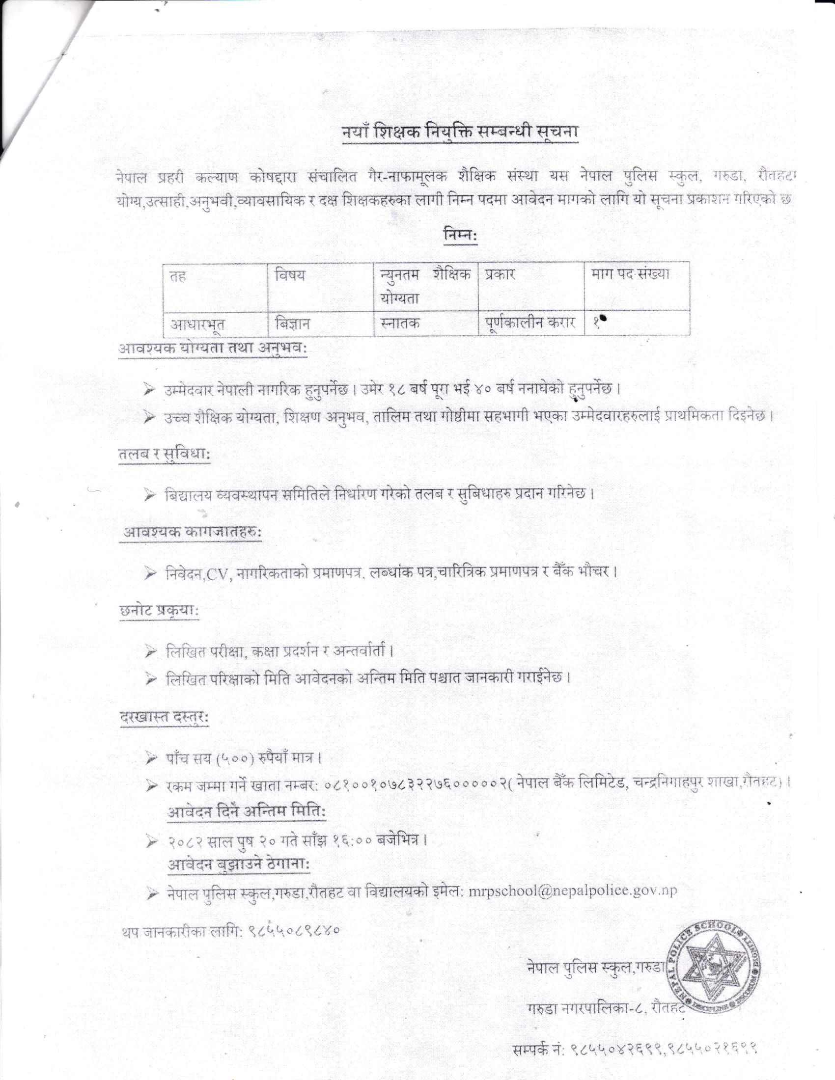 - जनपद प्रहरी समूहतर्फ प्रहरी निरीक्षक र प्रहरी सहायक निरीक्षक पदहरूको विज्ञापन प्रकाशन सम्बन्धी सूचना (२०८२-०८-२६)