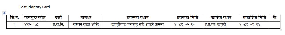 प्रहरी कर्मचारीको परिचय पत्र हराएको सम्बन्धी
