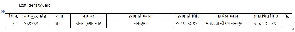 प्रहरी कर्मचारीको परिचय पत्र हराएको सम्बन्धी